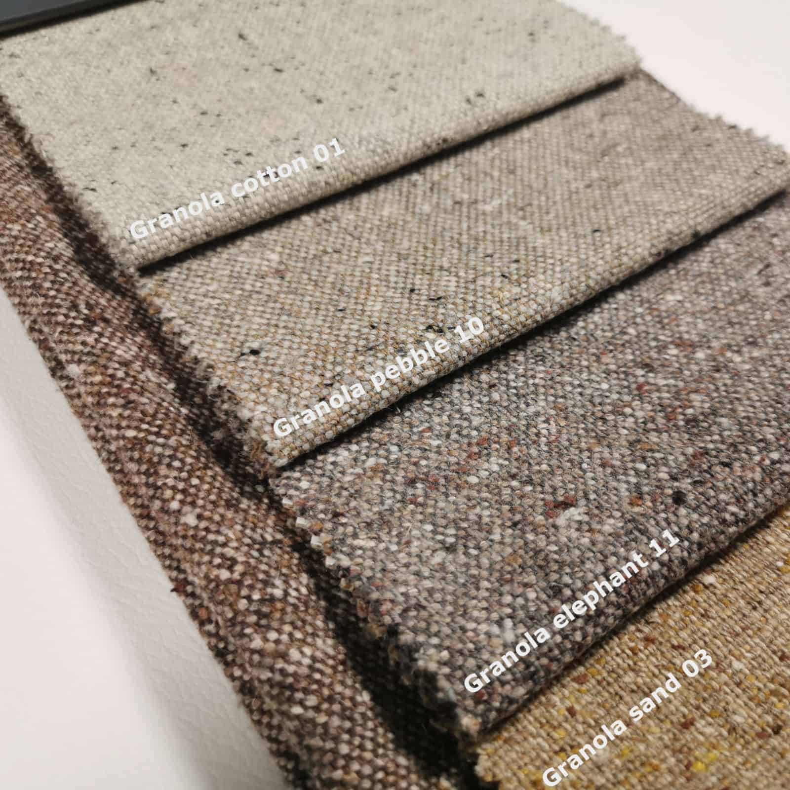 Granola to wysokiej jakości tkanina meblowa o wyrazistej, drobnoziarnistej strukturze i charakterystycznym melanżowym wyglądzie. Jej powierzchnia łączy stonowaną bazę kolorystyczną z nieregularnymi, delikatnymi akcentami barwnymi, które nadają materiałowi głębię i naturalny, niejednorodny charakter.