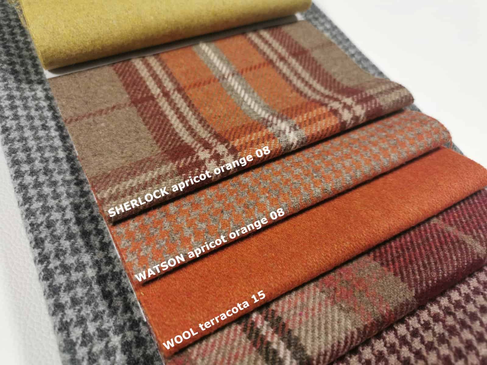 Watson apricot orange 08 to elegancka tkanina tapicerska z przewagą wełny z recyklingu, której wzór inspirowany jest klasyczną pepitką. Stanowi doskonałe uzupełnienie kolekcji Sherlock (krata) oraz gładkiej tkaniny Wool, pozwalając na tworzenie spójnych, a jednocześnie zróżnicowanych aranżacji.